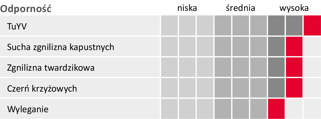 - Charakteryzuje się bardzo wysoką zdrowotnością, w tym posiada wybitną odporność na suchą zgniliznę kapustnych przez gen Rlm 7 oraz opornością na cylindrosporiozę i ma wysoką tolerancję na wertycyliozę.