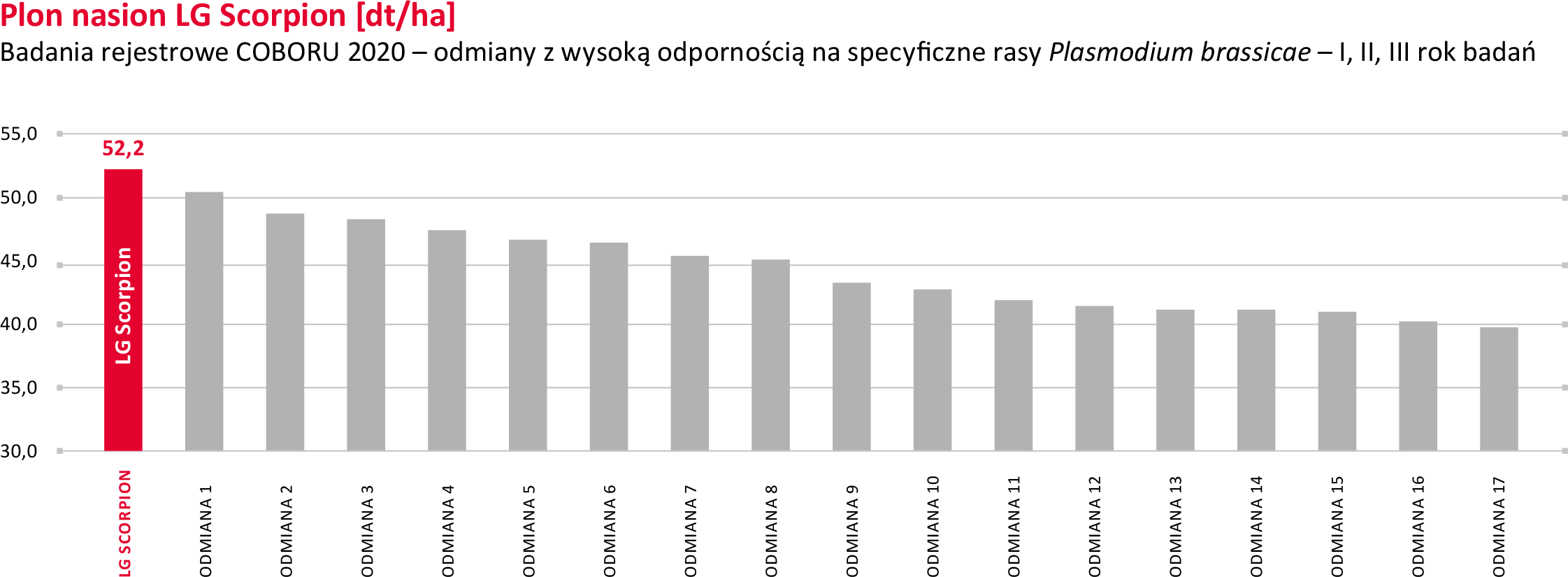 - Rzepak ozimy LG SCORPION to najbardziej innowacyjna na polskim rynku odmiana rzepaku ozimego w segmencie odmian o wysokiej odporności na specyficzne rasy kiły kapusty w rzepaku, którą potwierdzają oficjalne badania Instytutu Ochrony Roślin-PIB w Poznaniu.