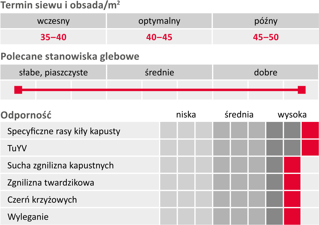 W badaniach rejestrowych mieszaniec uzyskał najwyższy plon w segmencie odmian odpornych na kiłę kapusty w rzepaku, dzięki czemu stał się liderem rynku (44,9 dt/ha – 117% wzorca COBORU 2019; 52,2 dt/ha – 118,1% wzorca COBORU 2020; 52,6 dt/ha – 110,8% wzorca COBORU 2021), a także w PDO 2022 (53,7 dt/ha – 109,6% wzorca); PDO 2023 (47,2 dt/ha – 105,9% wzorca) i PDO 2024 (40,0 dt/ha – 102% wzorca).