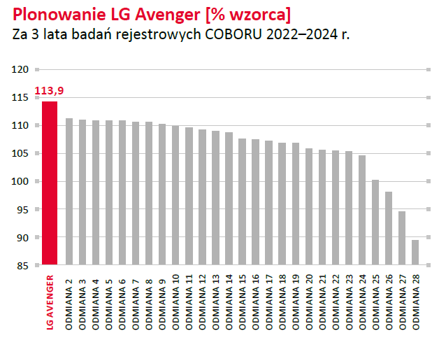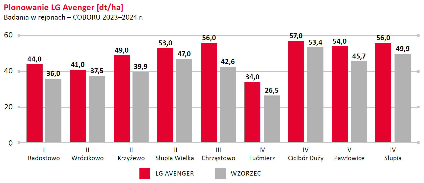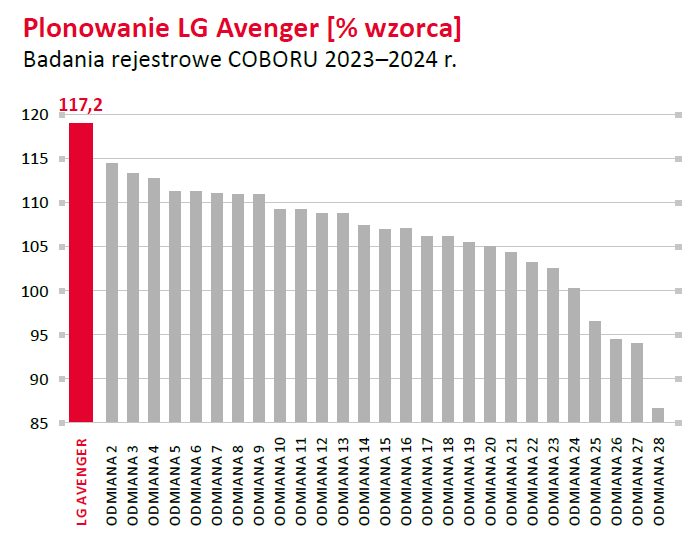 Linia genetyczna odmiany rzepaku mieszańcowego LG AVENGER łączy w sobie wyjątkowe cechy odpornościowe oraz wysoką wydajność plonowania. Zajmuje pozycję lidera w badaniach rejestrowych COBORU w latach 2021–2024, osiągając poziom aż 113,9% wzorca (50,33 dt/ha). Jest to nowy wzorzec COBORU.
