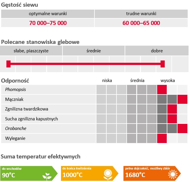 - Odmiana posiada odporność na agresywne rasy zarazy słonecznika Orobanche cumana, zapewniając większe bezpieczeństwo produkcji.